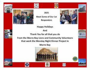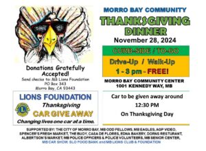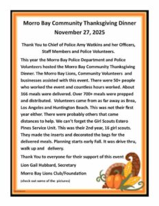 New to the 2025 Community Thanksgiving Dinner will be the coordinating partnership between the Lions Club and the local Morro Bay Police Department. Once again, we anticipate at least 800 meals to be served which will include home delivery as well as walk-up and drive-through service.